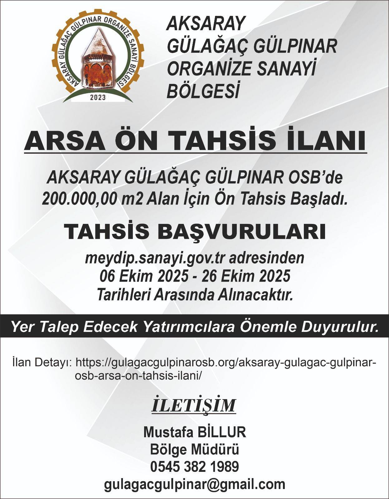Aksaray Gülağaç Gülpınar OSB Arsa Ön Tahsis İlanı